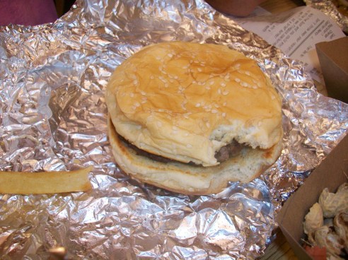 While the in-laws were in town for New Years we ventured to the new 5 Guys burger stand in Tempe and everyone found something to be thankful for and to be annoyed by – perfect holiday experience! The 4 burger eaters were all happy and enjoyed their burgers although the tall one said he wanted to take the group to In and Out burger the next day for what he feels is truly the very best burger. He was vetoed though as a burger a week really is the limit. I am not a beef eater so I enjoyed the 5 Guys grilled cheese with sauteed mushrooms and onions – very tasty! We all enjoyed the fries although do four adults and one child really need a grocery bag filled with fries – the volume was a bit much. We all also enjoyed the “while you wait” peanuts offered in the “help yourself” cardboard bins. What we didn’t enjoy at all was the blasting, blaring, very load music. So loud we couldn’t actually talk to each other. Maybe their idea is to have you shut up and enjoy the food but the loudness was too much for anyone over 30.