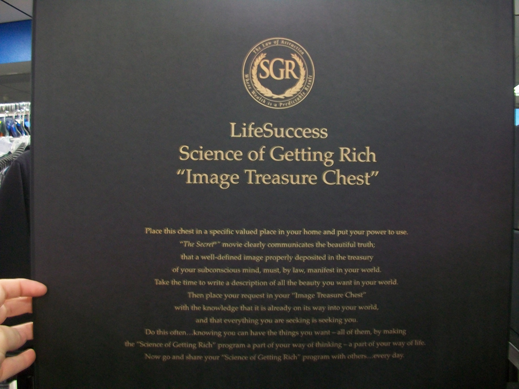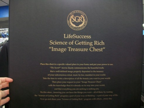 So I am wandering through a local thrift store the other day and see a giant wall of black boxes curious, I move in to investigate. I discovered these boxes were for Life Success Science of Getting Rich “Image Treasure Chest”. I chuckled a little at first and thought hmmm . . . . . someone didn’t ask the Universe hard enough for success because they put their life savings into making these boxes, no one bought them and now they are all stacked up in a Scottsdale thrift store. Then I thought – is it a savvy marketing plan? People will buy these boxes for $3.99 and then go home and look up the company online. I didn’t buy a box but I did look up the company and I found a blog website with a “SHOP” section featuring: