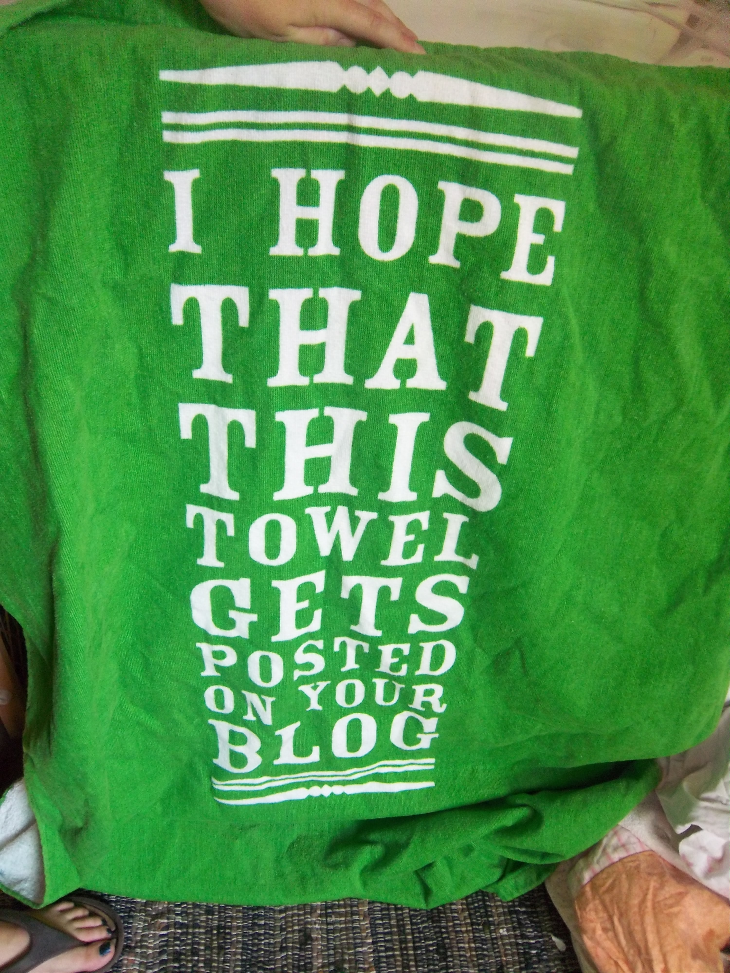 On a recent visit to Target for some gear and supplies for our upcoming camping road trip I found the perfect towels. They are an ugly green and kind of stupid – perfect for toss-a-ways after the trip. There was an entire pile of them and they were all on clearance at $2. For good reason too. All down the beach towel it reads “I hope that this towel gets posted on your blog” – Why? And who wants such a towel? It would have worked so much better to be naughty and say ” I hope what I am doing right now gets posted on your blog” Well, the real story for me is after washing the load of camping towels, as I get ready for the trip, the gigantic wad of green lint left behind in my dryer. They went from fluffy towels to thin rags in one wash – fine for a camping trip but really Target? Your not Walmart – you can do better.
