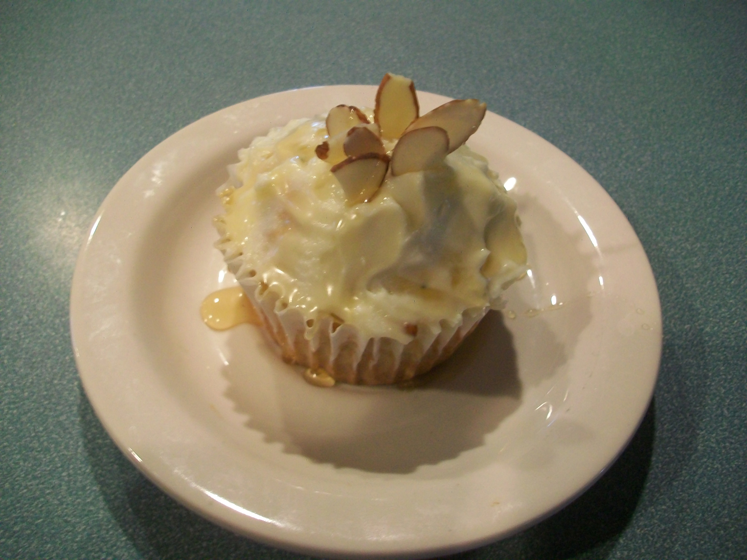 Mix 2 Tbls of Honey with a small container of mascarpone cheese. Spread in top of cooled cupcakes. Top with 3 slivered almonds and drizzle with honey.