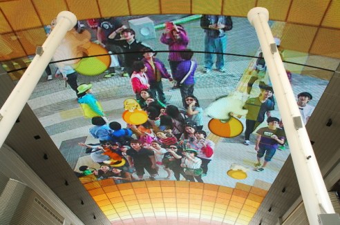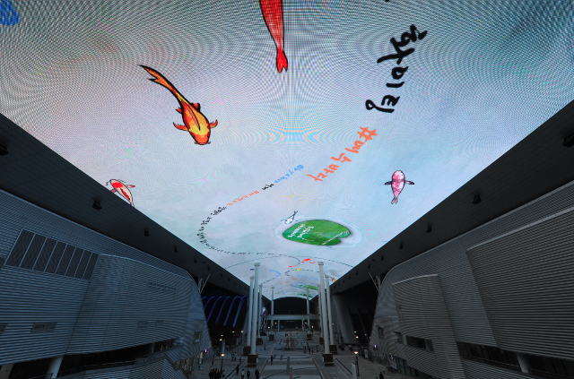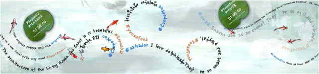 “Oceanus” is a large scale interactive project through Carnegie Mellon University that was designed for Yeosu World Expo 2012 which took place in Yeosu, South Korea and Pittsburgh, Pennsylvania, U.S. The project used Twitter Application Program Interface which allowed a broad audience to contribute to the project. When the audience tweeted designated hashtags, their written messages would show up on the screen mounted on the ceiling.