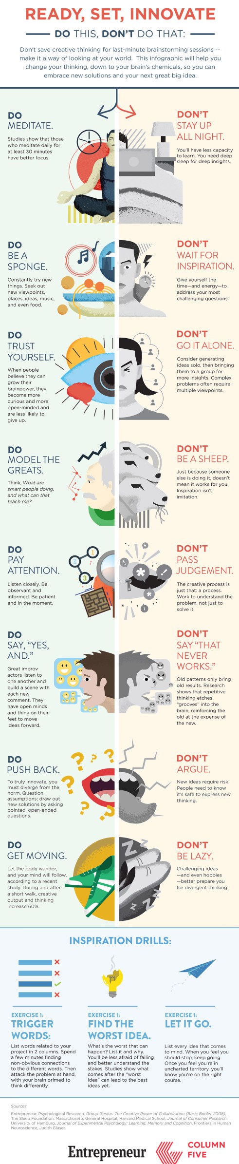 Are you having a difficult time coming up with ideas or thinking creatively? This infographic shows the do’s and don’ts of the creative process. Another source of inspiration is this TED talk by Shawn Achor “The Happy Secret to Better Work.”