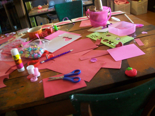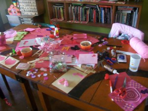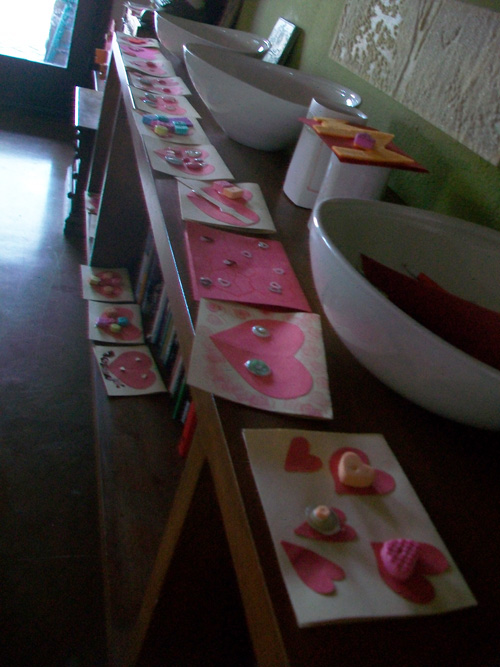 I was so proud of the short one for working so heard and personally making each of the twenty-five she needed for school. she worked all afternoon on Sunday. We had friends coming in and out of our crafternoon making V-day cards along with us. She loved making them and kept coming up with more names of people she should give them to. After we took a break to play outside for a while in the beautiful weather we came back in to the task of the short one having to sign each valentine. she started with enthusiasm and after about 5 cards the excitement left and the dread came. I told her we would go three by three. Signing three, taking a break to do something else and then starting the process again until we made it through. We then set them all out and she selected which card would be given to which child in her class or which teacher and I would write that name on the envelope and stuff the card. On Valentine’s day morning, she was so proud of her cards she couldn’t wait to get to school to share. I handed her bag filled with one of a kind designs and I left. At the end of the day when I picked her up she had a large back filled with things. I was so surprised by this. What happened to the Valentines Day “card”? This bag was filled with stickers, toys, candy pencils, erasers, plastic jewelry and so on.