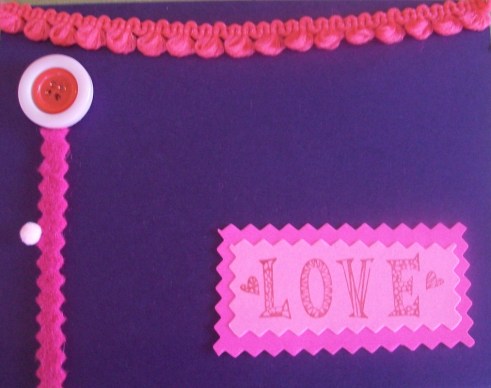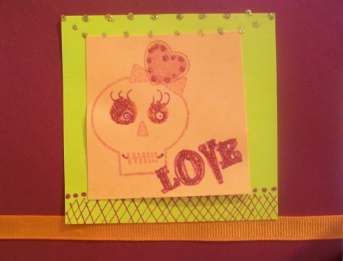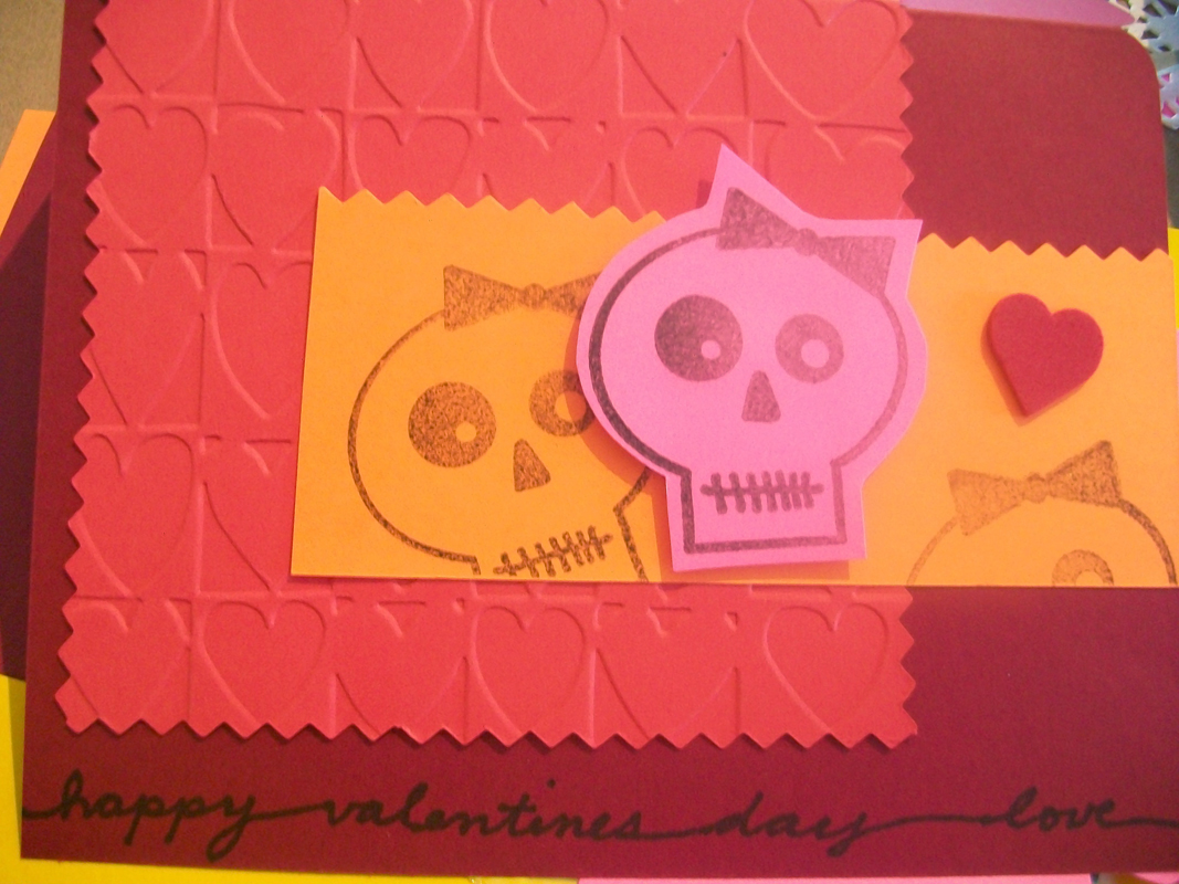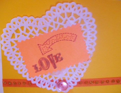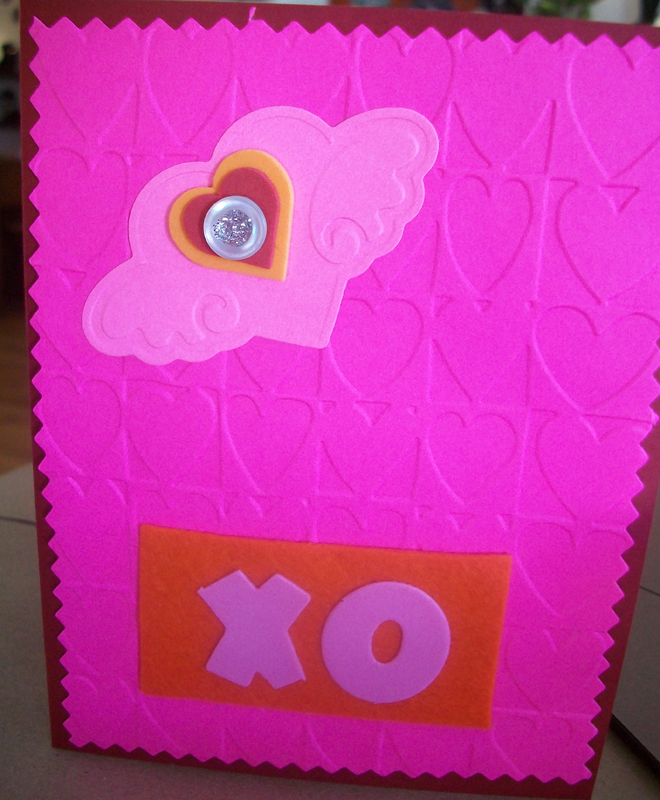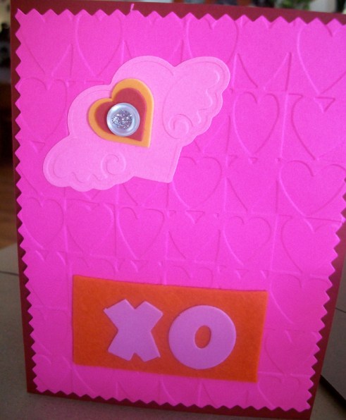 Card - by me, made with card stock, rubber stamps, drawing pens, ribbon and embossed hearts were made with a cuttlebug embossing folder
