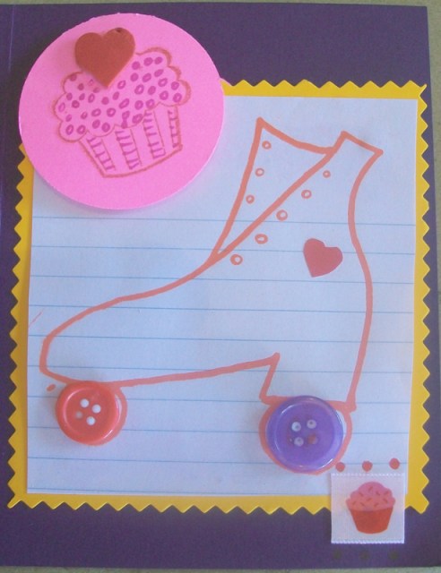 YUDU screen printed roller skate on notebook paper, rubber stamped cupcake, buttons and card stock - by me