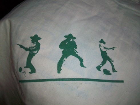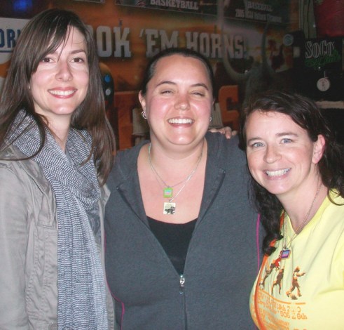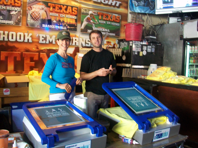 I went to SXSW in Austin with the fun folks from Provo Craft and Sarah from 26-Letters to screen print with the YUDU in partnership with Standard Recording Company. The guys from Standard Recording made a fun tee shirt with cowboys shooting yarn that we screened for a couple hundred friends at the Dirty Dog Bar on 6th Street. The bands that played all day were great! Thanks Standard Recording for the great sounds. And since all crafty folks stick together we also hung out with Jenny Hart from Sublime Stitching, the gals from Austin Etsy and Martha from Sunday Afternoon Housewife. We pulled screens, shopped a bit from the other folks, listened to music and drank a little beer. The Austin Etsy folks had a lino printing and book making workshop going on. Later that night we also had dinner with Jennifer Perkins of the Naughty Secretary’s Club. Her jewelry is soooo great!