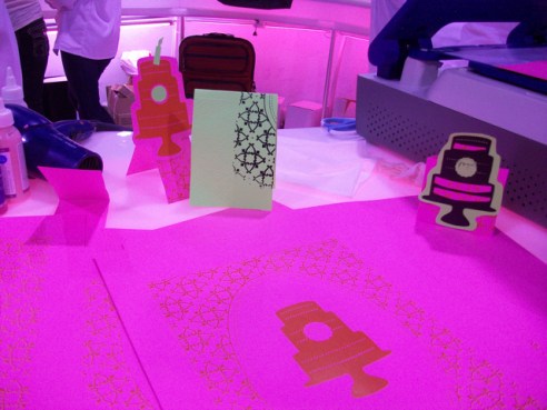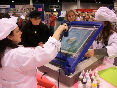 It’s ink people! Demoing the YUDU and Your Story for Provo Craft the last couple of days has been super fun. While all the other peeps in the booth are wearing nice clean white bakers jackets – mine is covered in red screen printing ink. What can I say I am trained as a painter and don’t generally concern myself with such things. After talking my throat raw (thanks for those who brought me water and cough drops!) I am reminded how great it would be to have screen printers in all of the schools just like the die cutters that are in every school. What great fundraiser opportunities! Another mission for me to focus on. Here are some booth shots from the last couple of days.